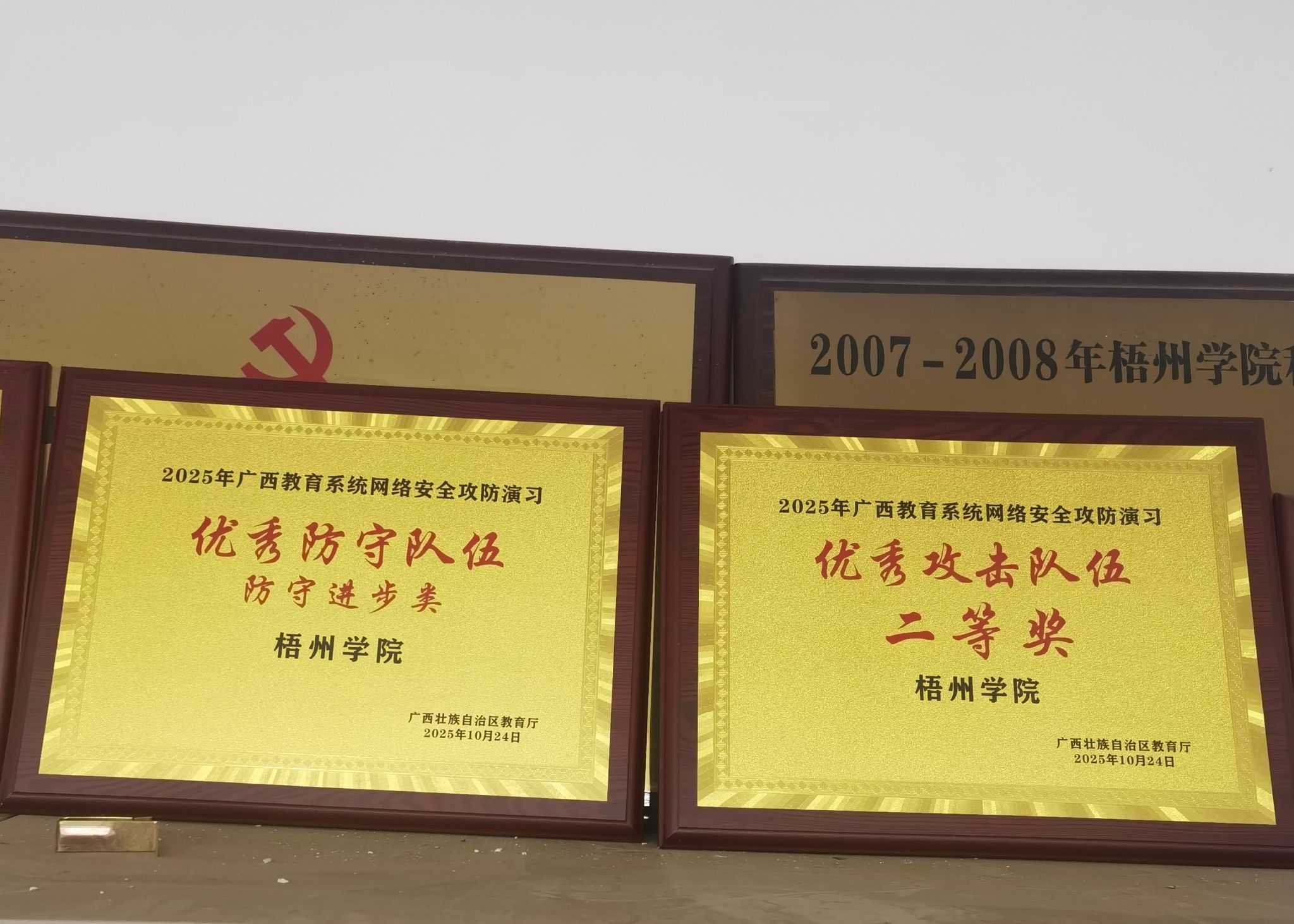 2025年 10月30日,我校受邀参加了广西壮族自治区教育厅在广西科技大学隆重召开的 “2025年广西教育系统网络安全攻防演习总结会暨网络安全技术论坛”。并在实战演习中荣获嘉奖“优秀攻击队伍二等奖”以及“优秀防守队伍防守进步奖”。